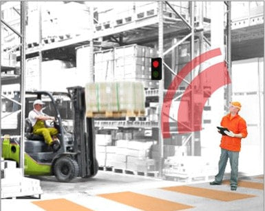 Bramki systemu PSG można łatwo włączyć w działanie Systemu kontroli ruchu TCS, co pozwala na łatwe i automatyczne współdziałanie z naszymi urządzeniami w celu uniemożliwienia pracownikowi pieszemu przejścia przez drogę, po której porusza się wózek widłowy, nawet w obszarach o słabej widoczności.