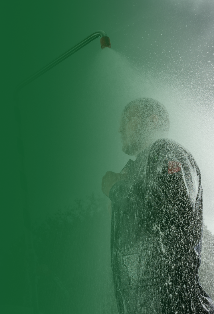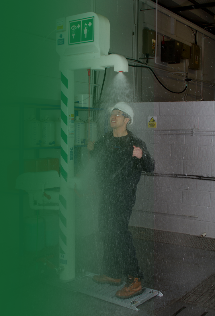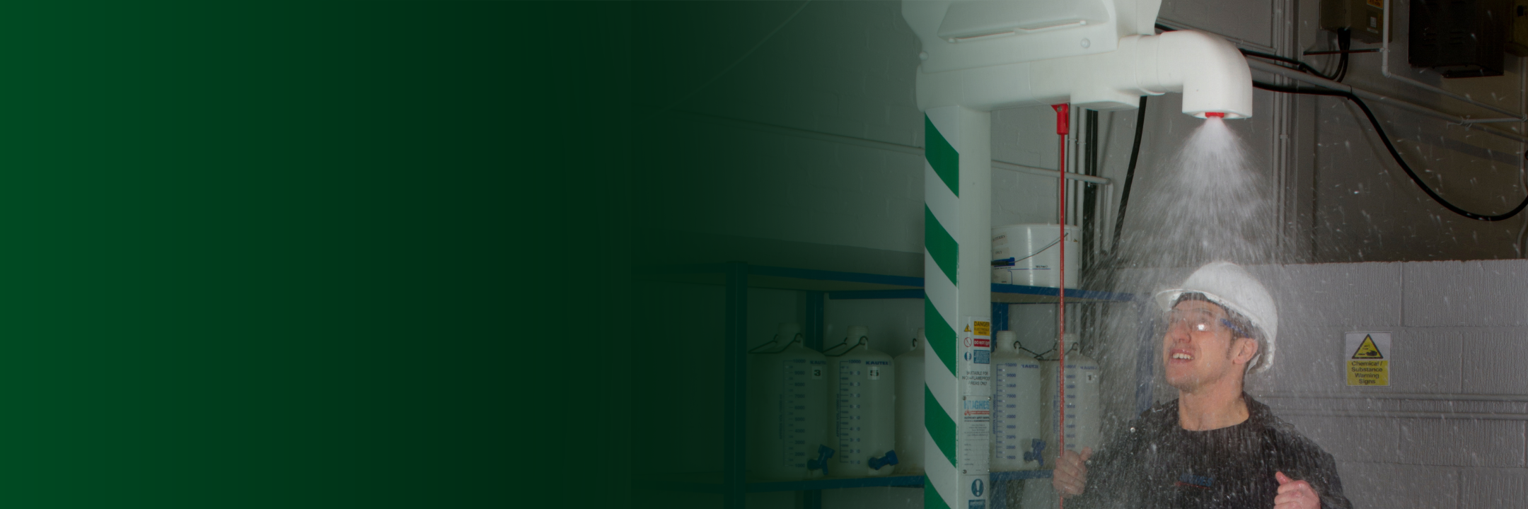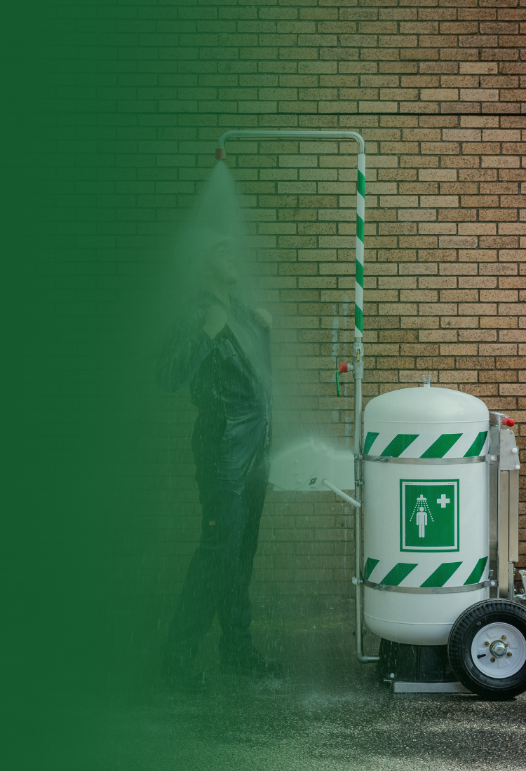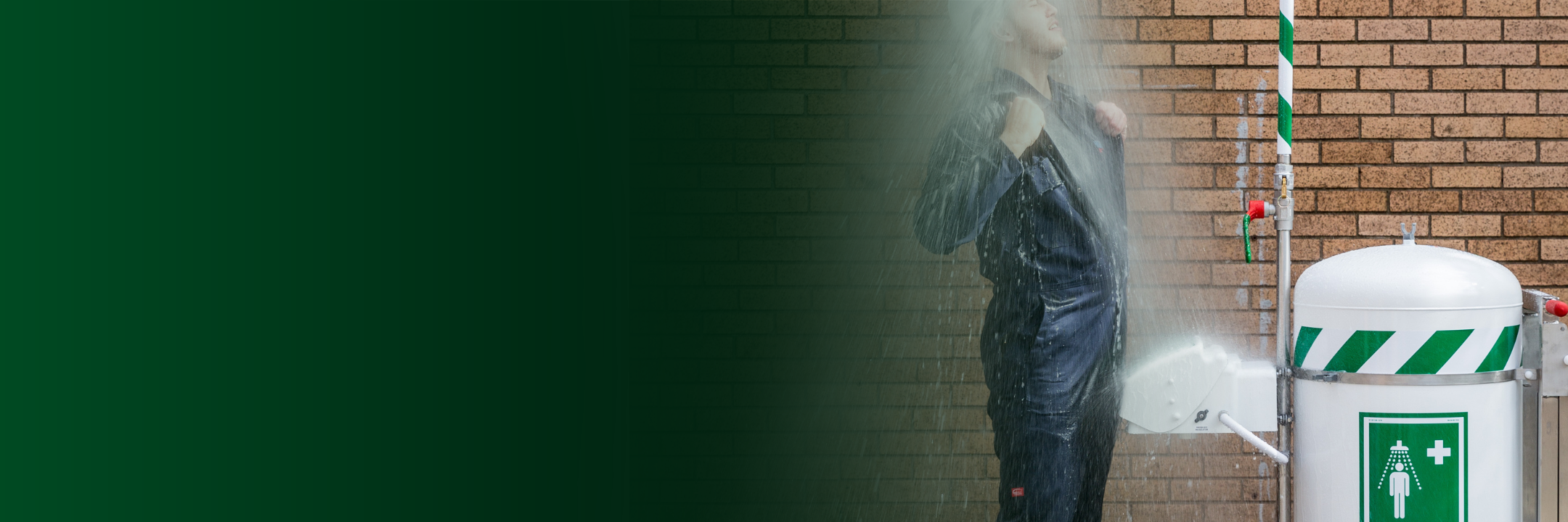 Natryski bezpieczeństwa zapewniają natychmiastową ulgę pracownikom ochlapanym niebezpiecznymi chemikaliami. Woda, dostarczana z prędkością co najmniej 76 litrów na minutę przez 15 minut, zmywa chemikalia ze skóry i z oczu.