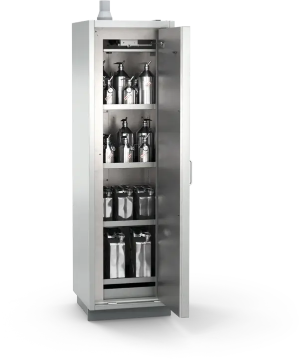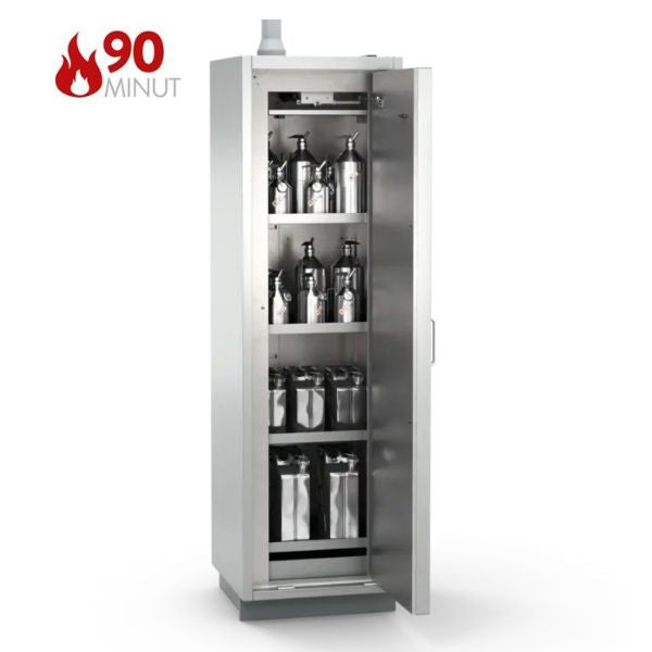 Szafa ognioodporna 90 min przeznaczona do bezpiecznego, pasywnego składowania materiałów łatwopalnych (niebezpiecznych) w pojemnikach o różnej pojemności, w pomieszczeniach czystych (tzw. Clean Room) klasy 5, w pobliżu stanowiska pracy. Profesjonalne rozwiązanie spełniające najwyższe normy polskie i europejskie, eliminujące potrzebę budowania oddzielnych pomieszczeń magazynowych.