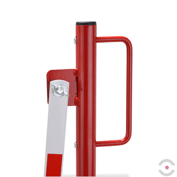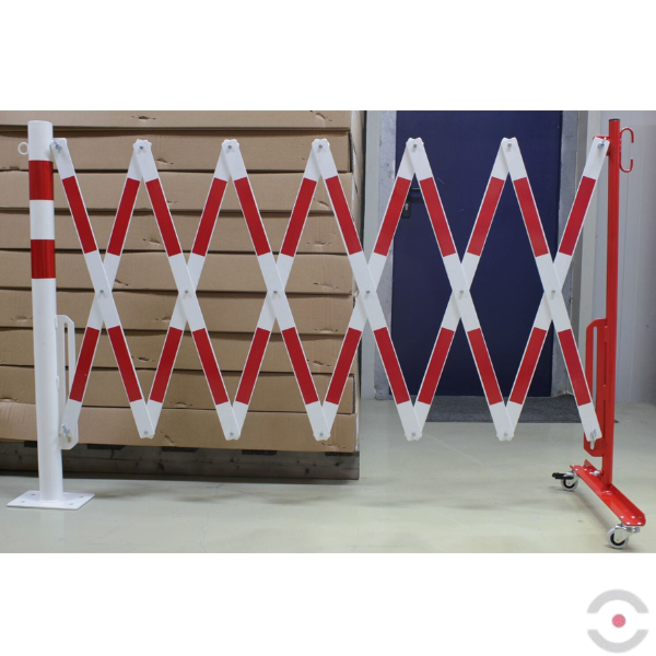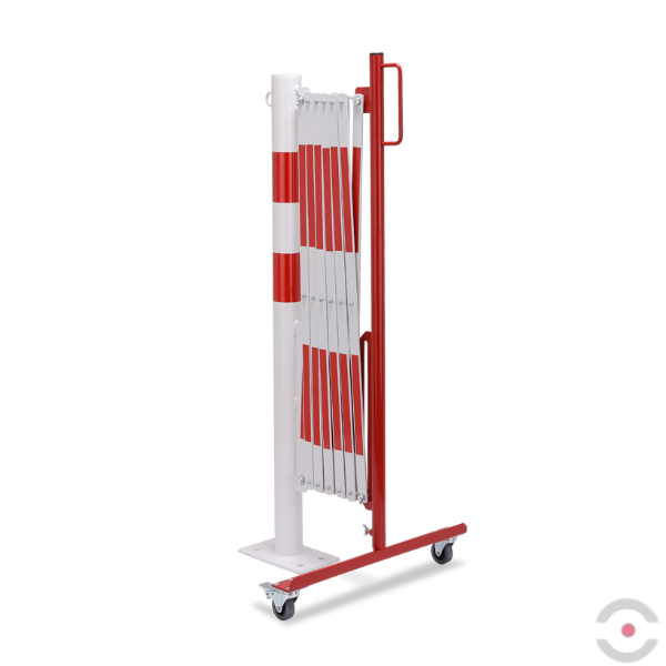 - Posiada słupek stalowy (śr. 60 mm, wysokość 1000 mm) mocowany do podłogi oraz jedną stabilną stopę na kółkach umożliwiającą wygodne manewrowanie barierą na podłodze