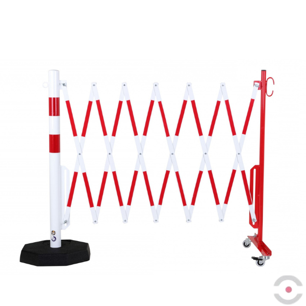 - Posiada słupek stalowy (śr. 60 mm, wysokość 1000 mm) mobilny z podstawą gumową (8 kg) oraz stabilną stopę na kółkach umożliwiającą wygodne manewrowanie barierą na podłodze