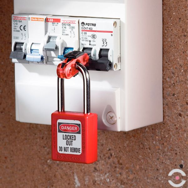 - Blokadę zakłada się na dźwigience wyłącznika, a jej zadaniem jest zablokowanie zasilania danego urządzenia lub instalacji, zapewniając bezpieczeństwo pracownikom