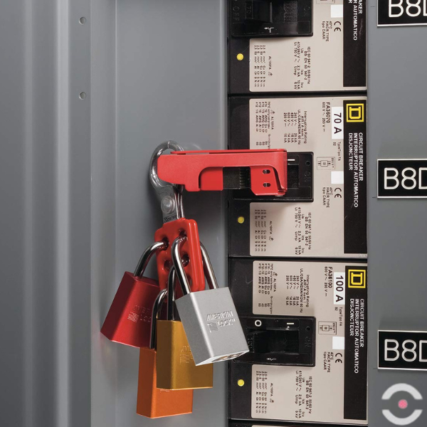 - Pozwala na założenie do 6 kłódek bezpieczeństwa o średnicy kabłąka do 6,35 mm
