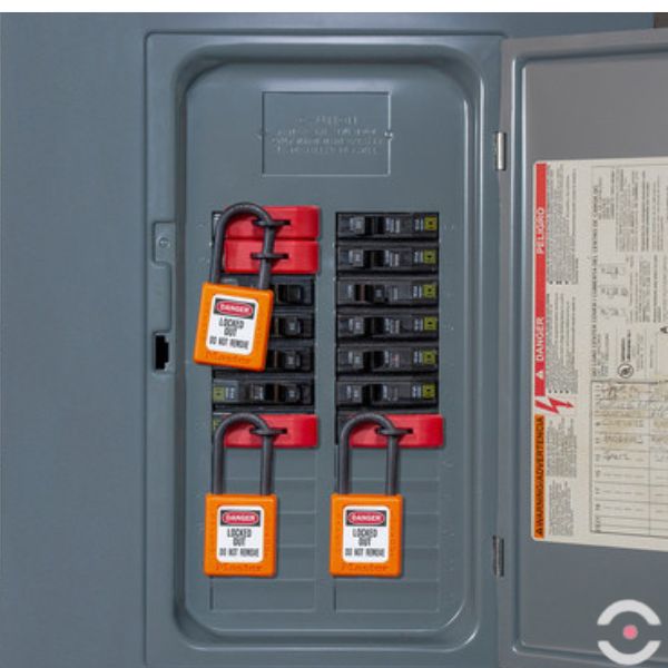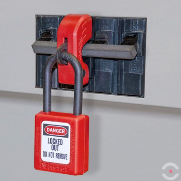 Uniwersalna blokada zakładana na dźwigience wyłącznika o napięciu 120/240 V, uniemożliwiająca zasilenie energią elektryczną urządzeń i instalacji ze względów bezpieczeństwa.