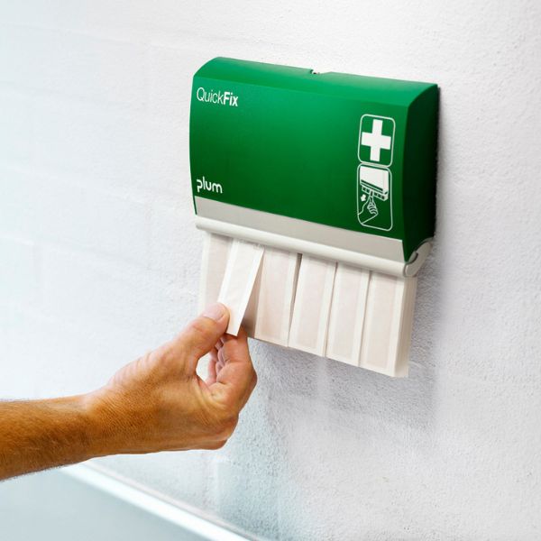 Dozownik plastrów Plum QuickFix z plastrami, zapewnia natychmiastowy dostęp do plastrów.