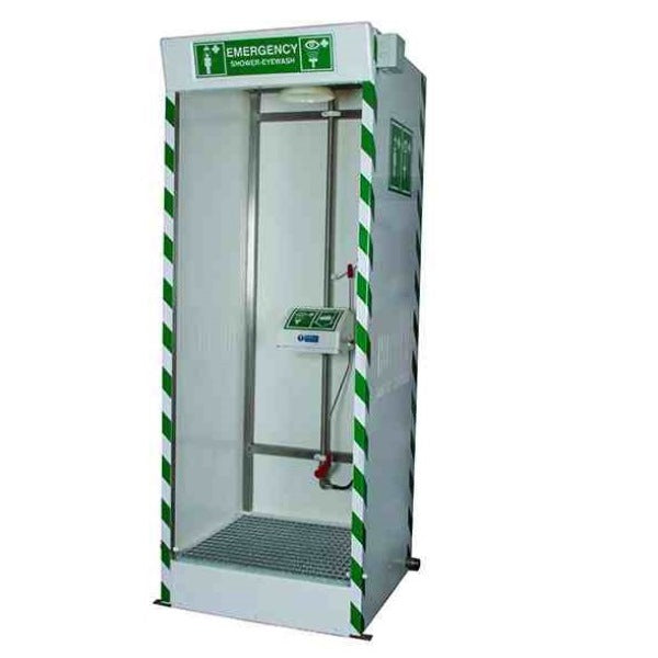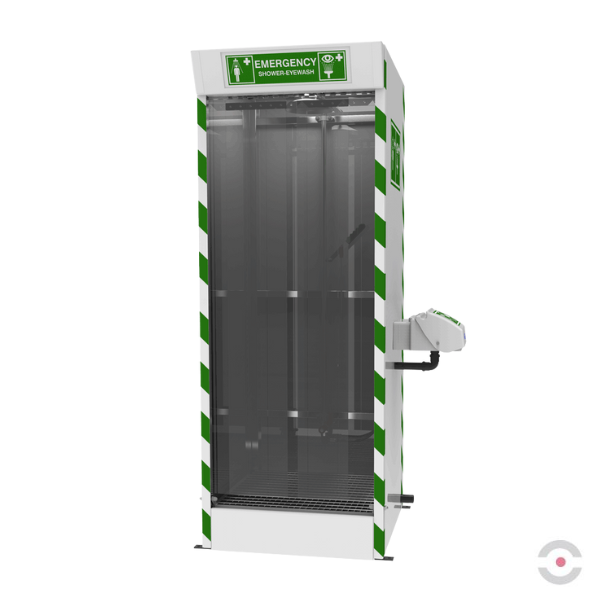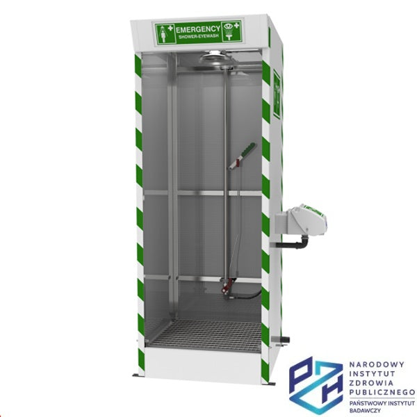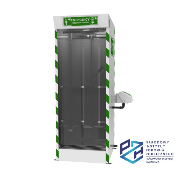 Kabina dekontaminacyjna z natryskiem bezpieczeństwa oraz zewnętrzną myjką do oczu i twarzy, zasilana wodą z sieci wodociągowej. Spełnia wymagania norm EN i ANSI. Zapewnia ochronę pracowników narażonych na kontakt z substancjami niebezpiecznymi. Przeznaczona do zastosowań w miejscach o szczególnie dużym zagrożeniu zachlapaniem płynami niebezpiecznymi oraz w sytuacjach wymagających ograniczenia rozbryzgu wody.