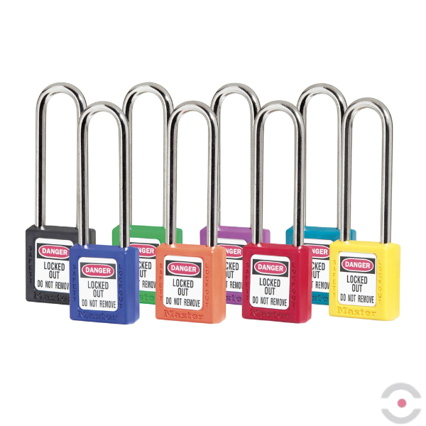 Kompozytowa kłódka bezpieczeństwa do blokad, używana przy blokadach elektrycznych i mechanicznych zarówno na zewnątrz jak i wewnątrz budynków.