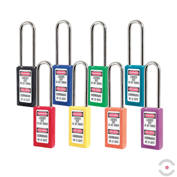 Kompozytowa kłódka bezpieczeństwa do blokad, używana przy blokadach elektrycznych i mechanicznych zarówno na zewnątrz jak i wewnątrz budynków.