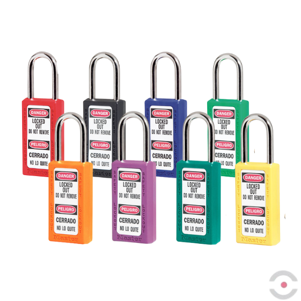 Kompozytowa kłódka bezpieczeństwa do blokad, używana przy blokadach elektrycznych i mechanicznych zarówno na zewnątrz jak i wewnątrz budynków.