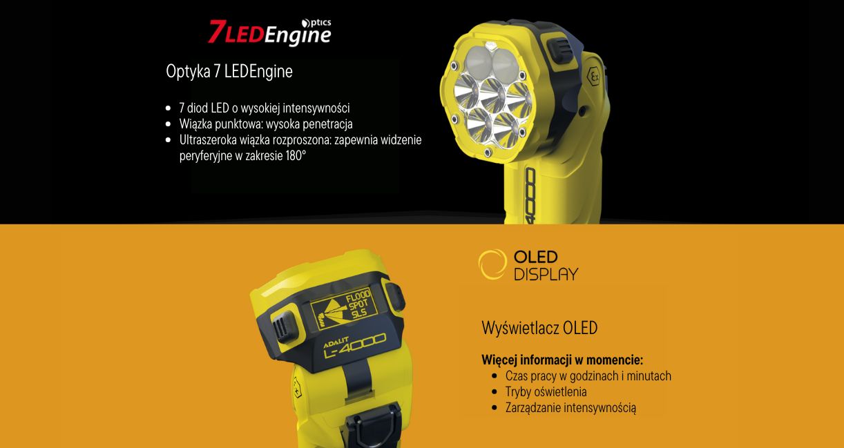 - Siedem diod LED zapewnia różnorodne wiązki światła: użytkownik może wykorzystać zarówno mocno skupione światło punktowe, jak i szeroko rozproszone, dzięki czemu latarka doskonale nadaje się do pracy na krótkim i długim dystansie