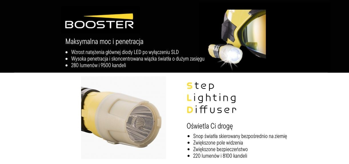 - W trybie BOOSTER, po zdjęciu dyfuzora, latarka osiąga maksymalną moc i zasięg światła, co sprawdza się podczas przeszukiwania dużych obszarów lub w ekstremalnych warunkach
