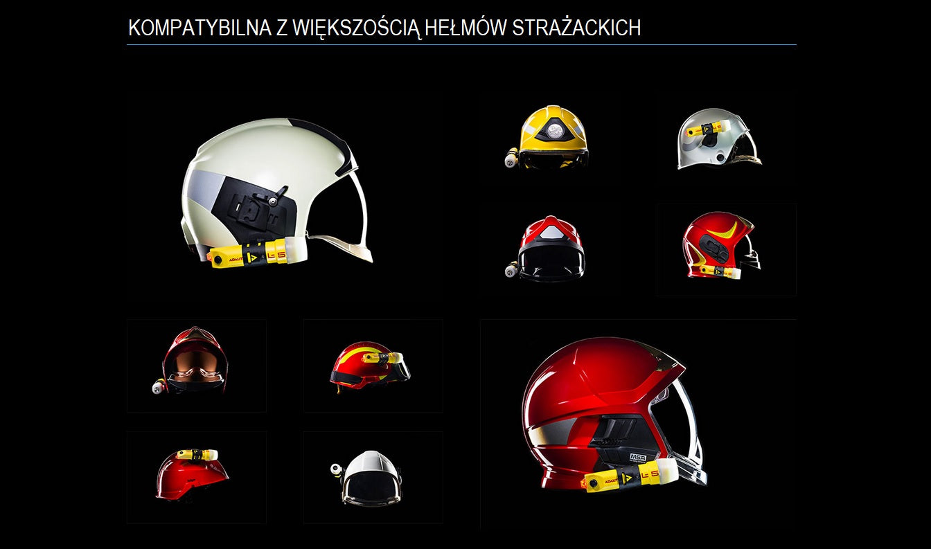 - Kompatybilność z większością dostępnych hełmów strażackich umożliwia łatwy i pewny montaż na nakryciu głowy bez dodatkowych adapterów