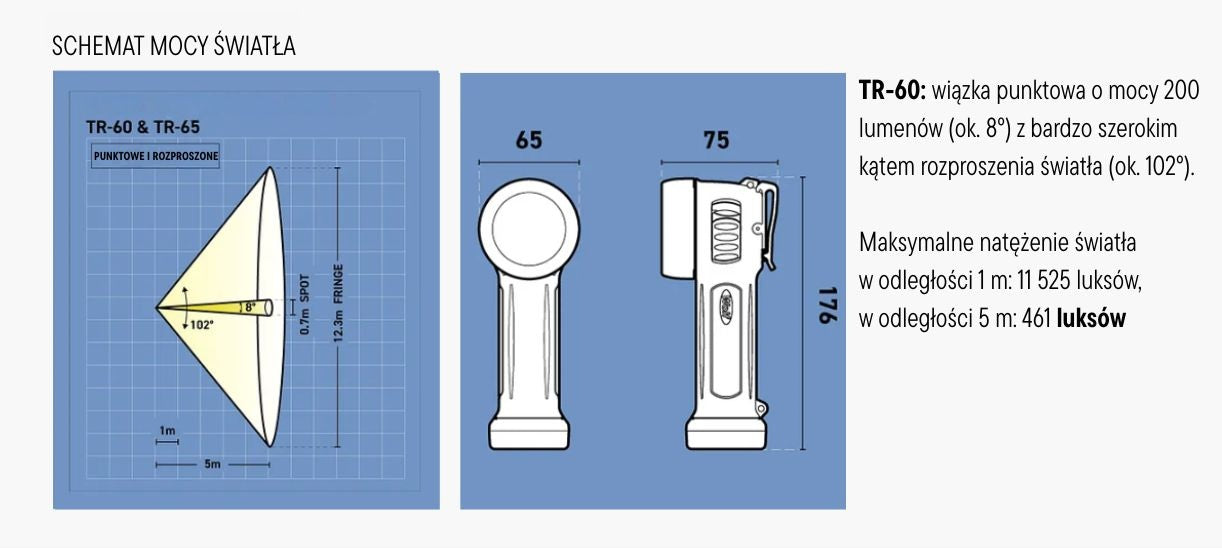 - Certyfikat ATEX (II 2G Ex ib I Mb/IIC T3/T4 Gb | II 2D Ex ib IIIB T200°C D | I M2) dopuszcza stosowanie latarki w strefach 1, 2 (gazy) oraz 21, 22 (pyły), stopień ochrony IP67