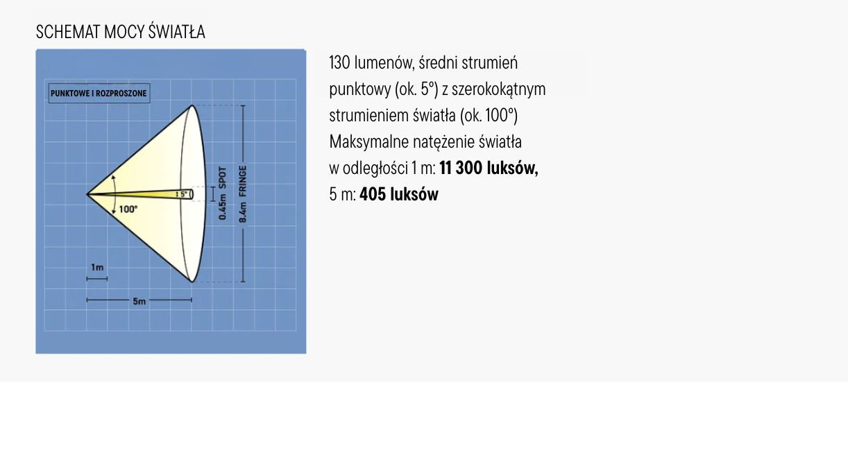 - Wbudowane źródło światła, 1 dioda LED, generuje strumień o jasności do 130 lm, zapewniając skuteczne oświetlenie w wymagających warunkach pracy