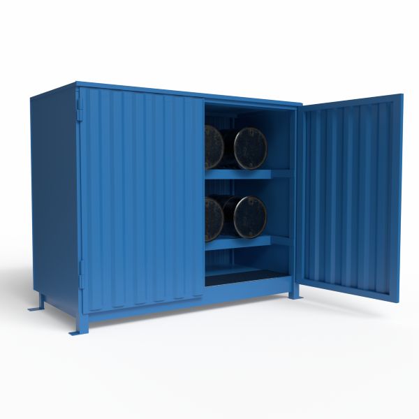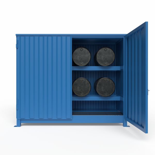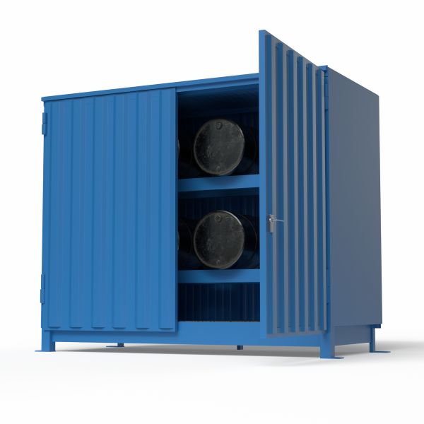 Magazyn na beczki, przeznaczony do składowania beczek 60 l i 200 l z czynnikami niebezpiecznymi, wszystkich klas zagrożenia, w pozycji leżącej z możliwością bezpośredniej eksploatacji.