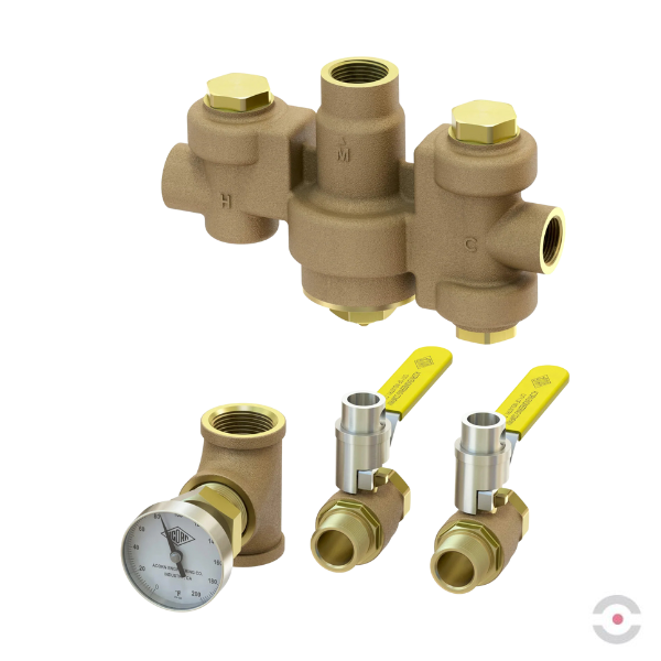 - W zestawie znajdują się: dwa zawory kulowe odcinające, wskaźnik temperatury oraz zawór mieszający termostatyczny z wbudowanym obejściem zimnej wody.