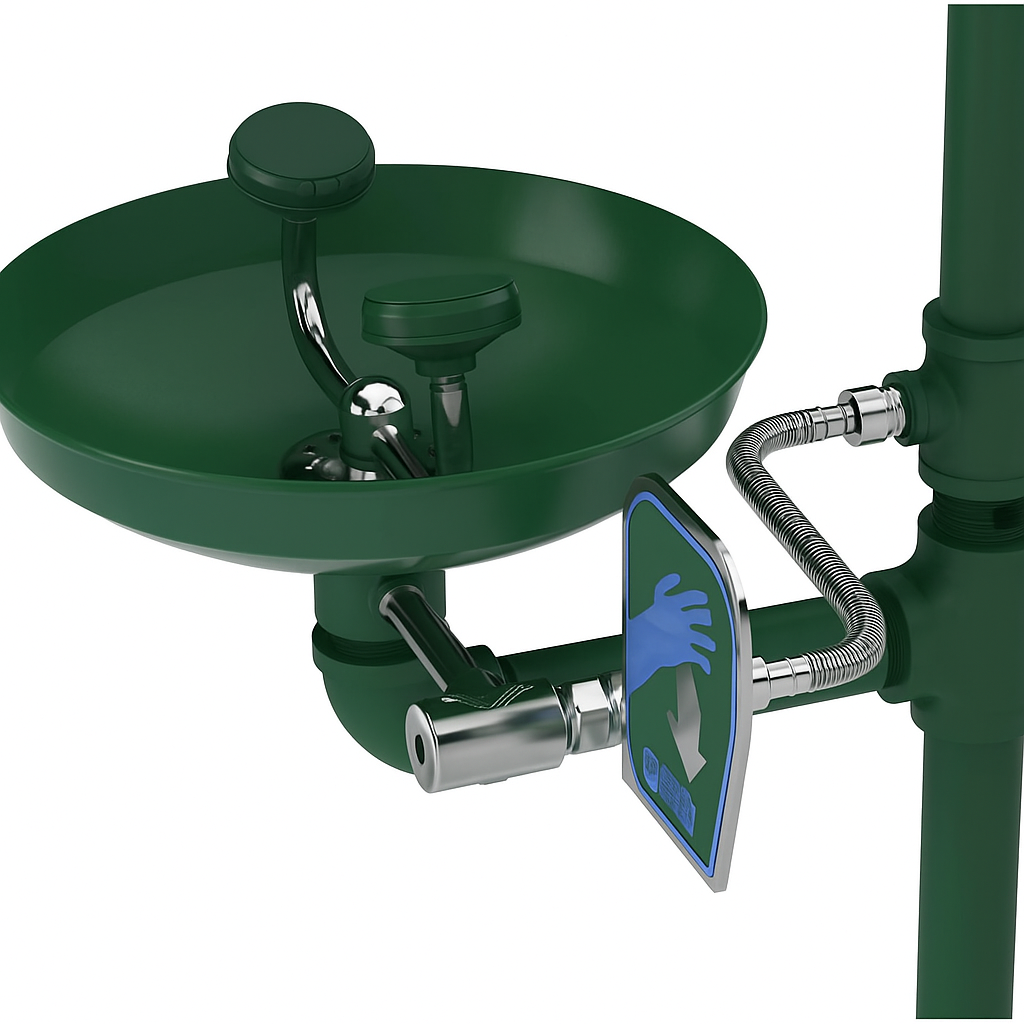 - Myjka do oczu posiada misę z tworzywa ABS o średnicy 299 mm, wydajności 14 l/min, uruchamiana przy pomocy dźwigni ręcznej, lub pedału nożnego.