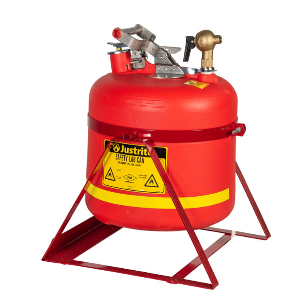 Zabezpieczający pojemnik laboratoryjny, polietylenowy, umożliwia wygodne i bezpieczne przelewanie płynów łatwopalnych do małych probówek, naczyń i zlewek.