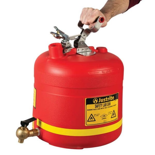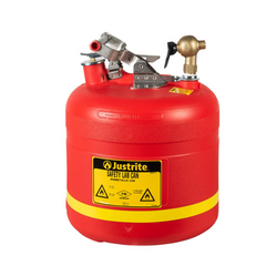 Zabezpieczający pojemnik laboratoryjny, polietylenowy, umożliwia wygodne i bezpieczne przelewanie płynów łatwopalnych do małych probówek, naczyń i zlewek.