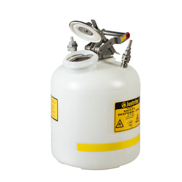 Polietylenowy, zabezpieczający pojemnik służący do skutecznego i bezpiecznego zbierania odpadów w trakcie procesów chromatografii cieczowej (HPLC).
