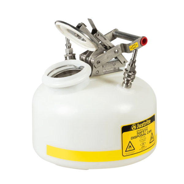 Polietylenowy, zabezpieczający pojemnik służący do skutecznego i bezpiecznego zbierania odpadów w trakcie procesów chromatografii cieczowej (HPLC).