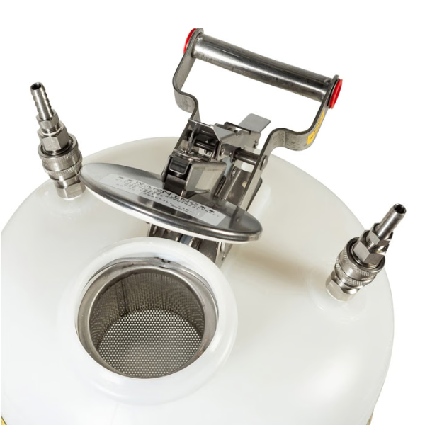 - Podłączanie i odłączanie odbywa się przy zamkniętym zaworze, dzięki czemu nie ma ryzyka uwolnienia par lub rozlania rozpuszczalnika