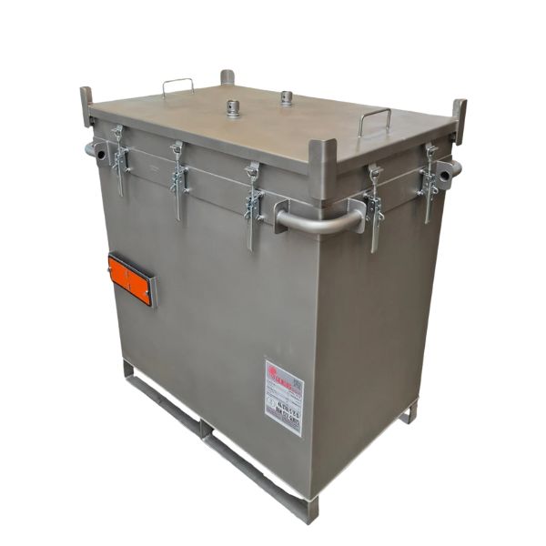 Certyfikowany, wielokrotnego użytku pojemnik transportowo-magazynowy wykonany ze stali nierdzewnej, przeznaczony do bezpiecznego przechowywania oraz transportu akumulatorów litowo-jonowych, modułów bateryjnych i ogniw, w tym również krytycznie uszkodzonych. Pojemnik został zaprojektowany z myślą o najwyższym poziomie bezpieczeństwa oraz pełnej zgodności z międzynarodowymi przepisami transportu towarów niebezpiecznych ADR.