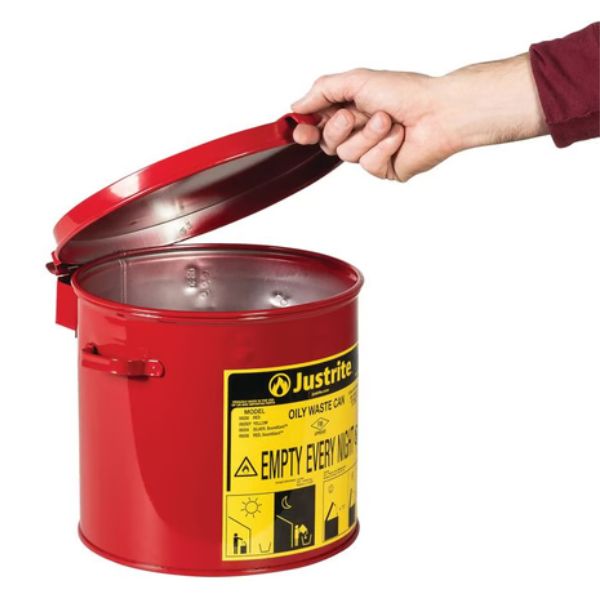 Pojemnik zabezpieczający stalowy na odpady olejowe przeznaczony do użytku w miejscach, w których stosowane są tkaniny nasączone rozcieńczalnikami, rozpuszczalnikami, olejami, w tym olejem lnianym, klejami łatwopalnymi oraz innymi płynami łatwopalnymi.