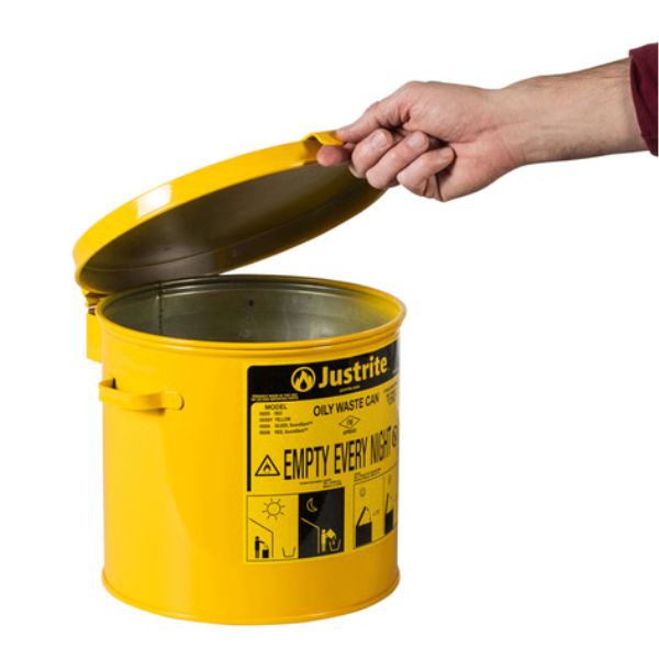Pojemnik zabezpieczający stalowy na odpady olejowe przeznaczony do użytku w miejscach, w których stosowane są tkaniny nasączone rozcieńczalnikami, rozpuszczalnikami, olejami, w tym olejem lnianym, klejami łatwopalnymi oraz innymi płynami łatwopalnymi.