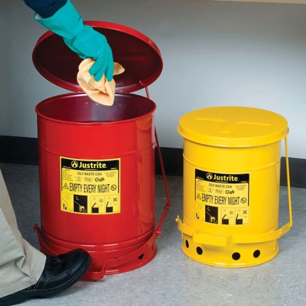 Pojemnik zabezpieczający stalowy na odpady olejowe przeznaczony do użytku w miejscach, w których stosowane są tkaniny nasączone rozcieńczalnikami, rozpuszczalnikami, olejami, w tym olejem lnianym, klejami łatwopalnymi oraz innymi płynami łatwopalnymi.