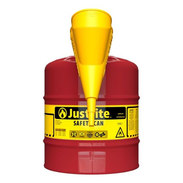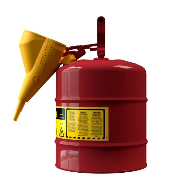 Pojemnik zabezpieczający stalowy na płyny łatwopalne z lejkiem, pozwala na wygodne i bezpieczne przelewanie płynów łatwopalnych i kontrolowanie ich oparów.