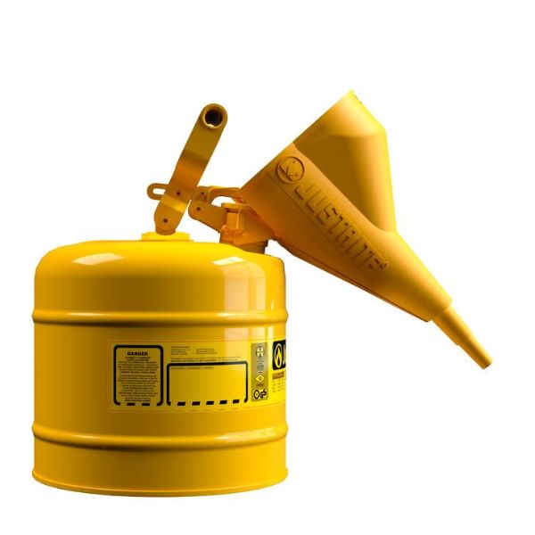 Pojemnik zabezpieczający stalowy na płyny łatwopalne z lejkiem, pozwala na wygodne i bezpieczne przelewanie płynów łatwopalnych i kontrolowanie ich oparów.