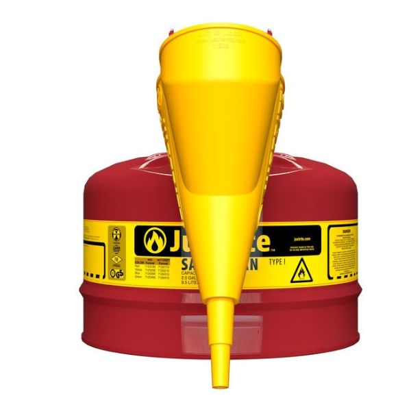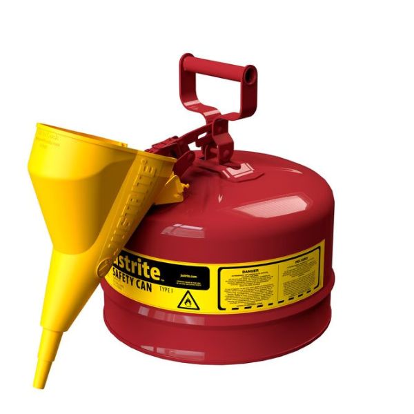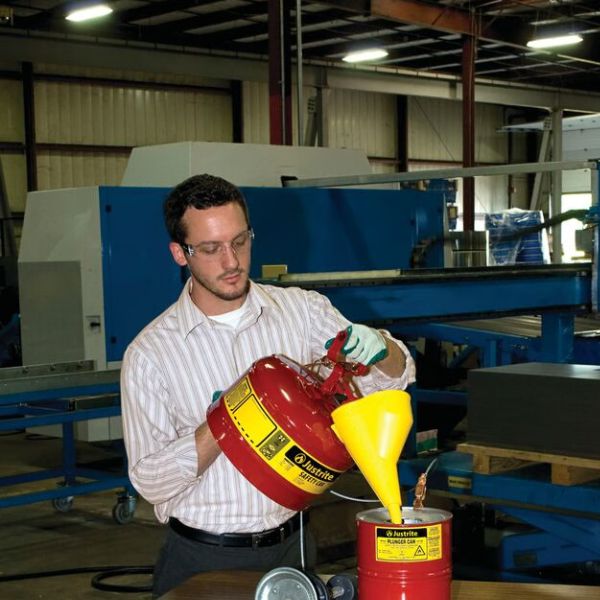Pojemnik zabezpieczający stalowy na płyny łatwopalne z lejkiem, pozwala na wygodne i bezpieczne przelewanie płynów łatwopalnych i kontrolowanie ich oparów.