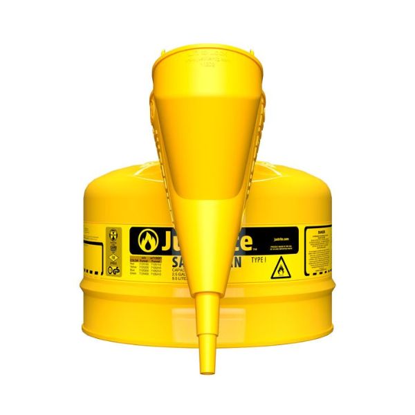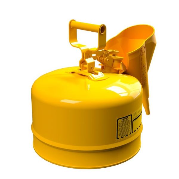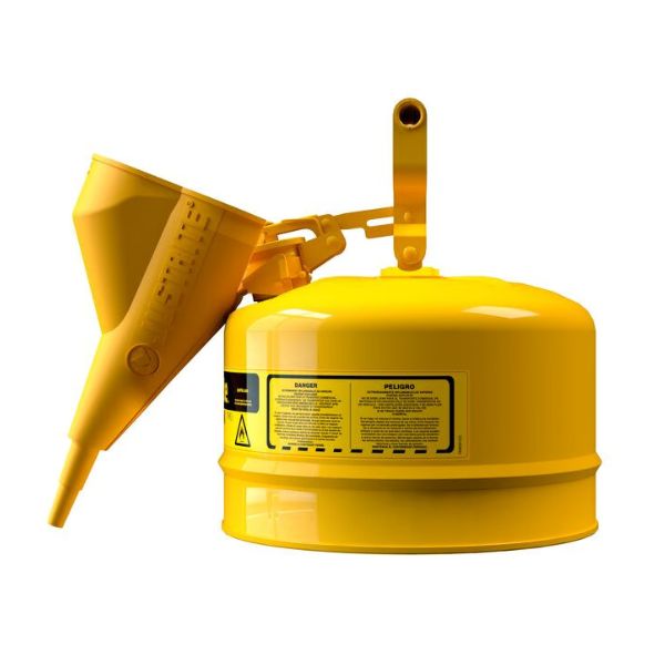Pojemnik zabezpieczający stalowy na płyny łatwopalne z lejkiem, pozwala na wygodne i bezpieczne przelewanie płynów łatwopalnych i kontrolowanie ich oparów.