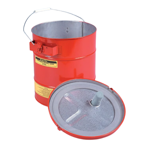 Zabezpieczający, stalowy pojemnik ogranicza ryzyko rozlania płynu przy mieszaniu niebezpiecznych cieczy łatwopalnych.