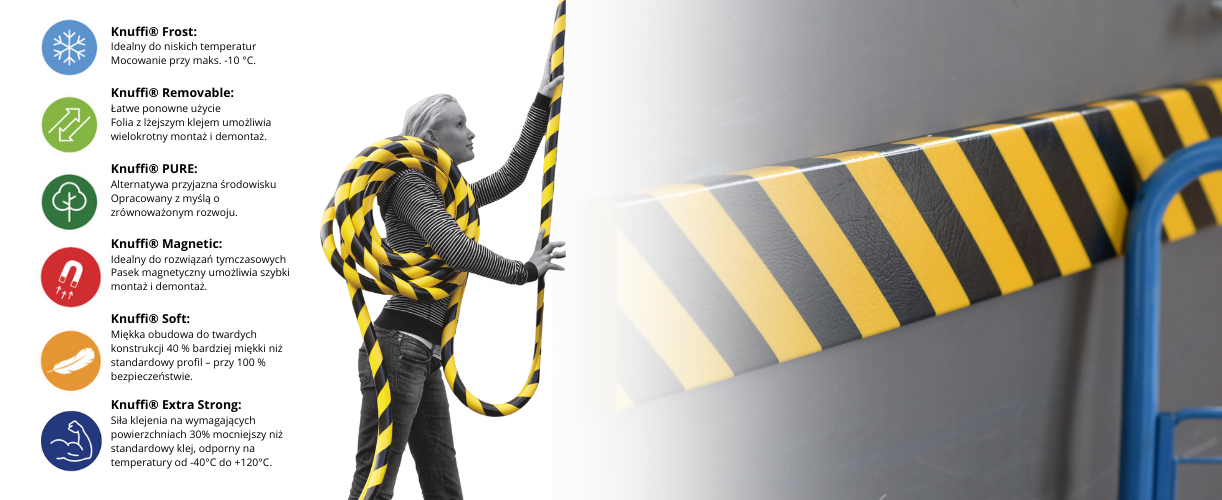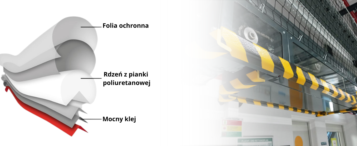 - Wykonany z wysokiej jakości pianki poliuretanowej, która chroni przed urazami ciała oraz zabezpiecza elementy maszyn, regałów, dróg transportowych i niskich stropów przed uszkodzeniami