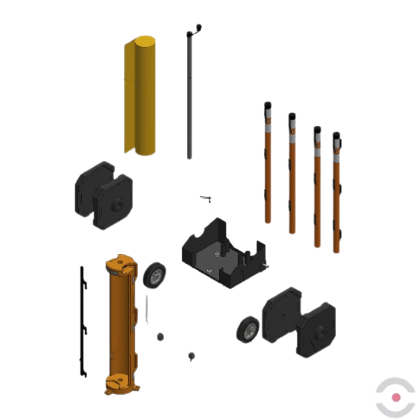 - System na kółkach zawiera : 4 pomarańczowe słupki z blokadą krańcową, 4 magnetyczne zaczepy mocujące siatkę oraz 4 gumowe podstawki
