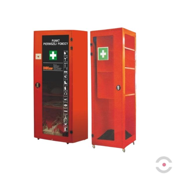 Punkt Pierwszej Pomocy dla administracji w metalowej szafie z przenośnym Zestawem Pierwszej Pomocy ZPP typu C w oddzielnej walizce lub torbie.