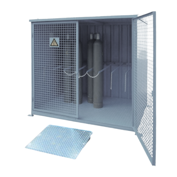 Rampa podjazdowa do magazynów chemicznych na butle gazowe. Ułatwia wjeżdżanie wózkami podnośnikowymi do wnętrza magazynu, zapewniając wygodę i bezpieczeństwo obsługi.