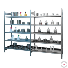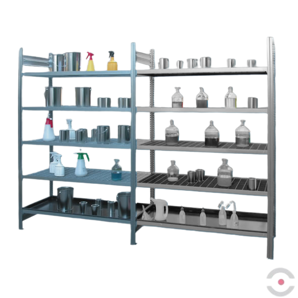 Regały do przechowywania substancji zagrażających wodzie, wyposażone w dolną wannę wychwytową oraz regulowane, ocynkowane półki kratowe zapewniają wysoką nośność, bezpieczeństwo i elastyczną konfig...
