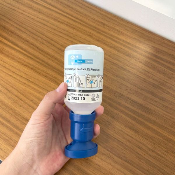 Płyn PLUM PH Neutral to niewielka i łatwa w użyciu, sterylnie zamknięta butelka zawierająca bufor fosforanowy do płukania oczu w przypadku zalania ich substancjami kwasowymi lub zasadowymi.