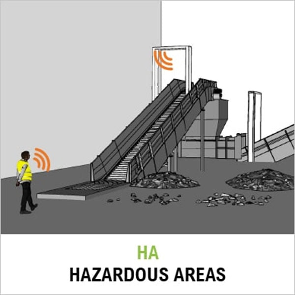 HA (Hazardous Areas) to elektroniczny system bezpieczeństwa stanowiący uzupełnienie istniejących środków ochronnych maszyn i przenośników. Wykrywa obecność osób w strefach ryzyka i inicjuje bezpieczne zatrzymanie pracy urządzeń. Działa w pełni automatycznie i nie wymaga stałej interwencji operatora.
