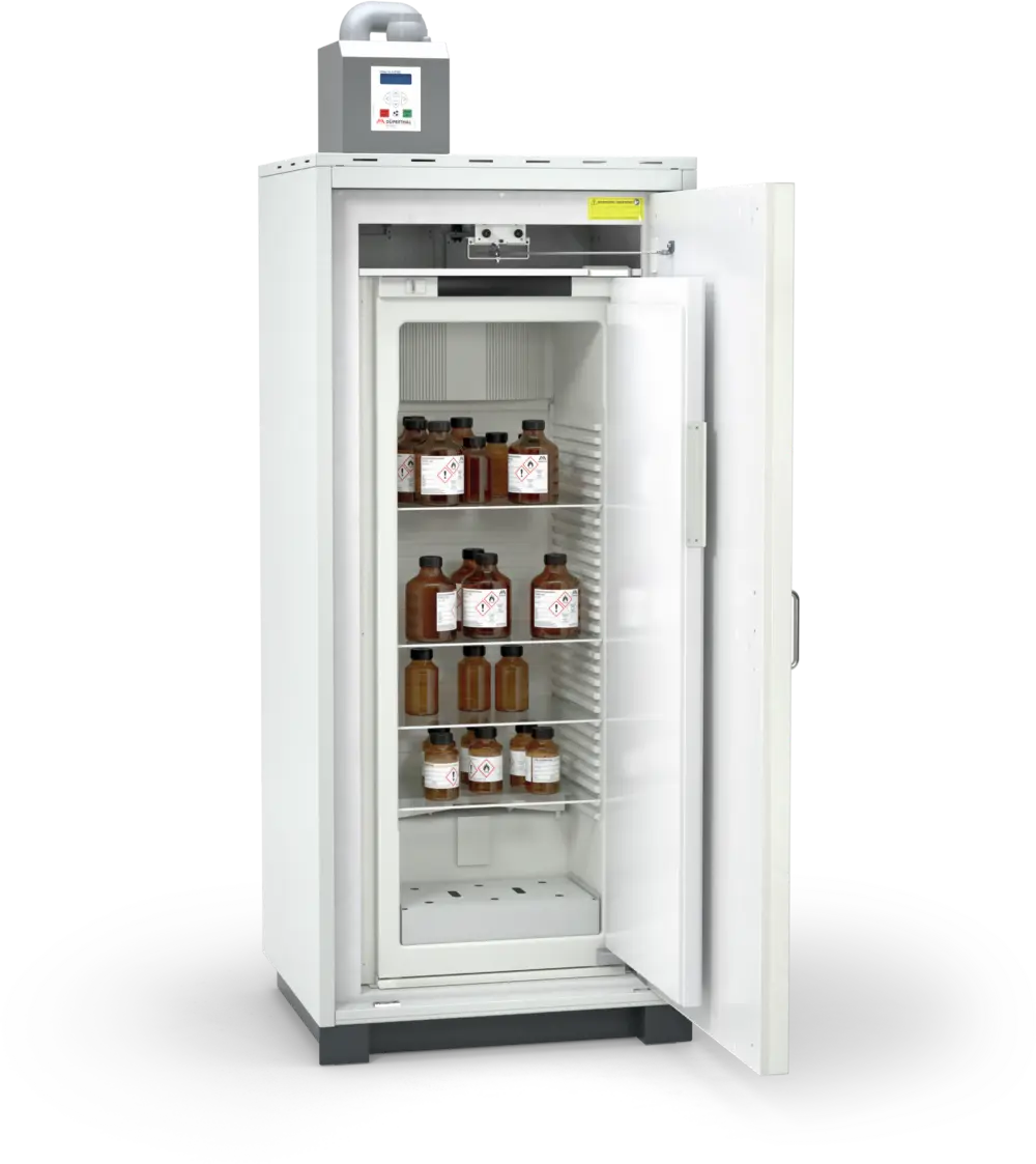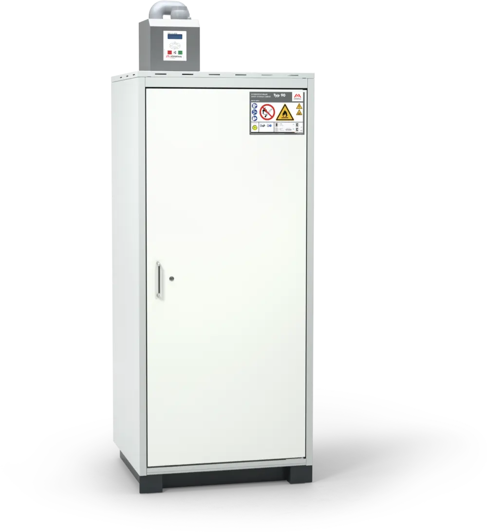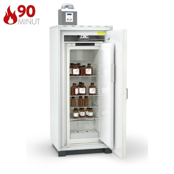 Szafa ognioodporna 90 min została zaprojektowana do schłodzonego, pasywnego przechowywania materiałów łatwopalnych w pojemnikach o różnych pojemnościach. Stosowana w pomieszczeniach roboczych takich jak laboratoria i hale produkcyjne, w bezpośredniej bliskości stanowiska pracy. Zintegrowana lodówka wbudowana w przeciwwybuchową konstrukcję, pozwala na przechowywanie substancji wymagających niskiej temperatury. Urządzenie spełnia najwyższe normy krajowe i europejskie, eliminując konieczność budowy osobnych magazynów na substancje niebezpieczne, a tym samym zwiększając bezpieczeństwo i wygodę codziennej pracy.