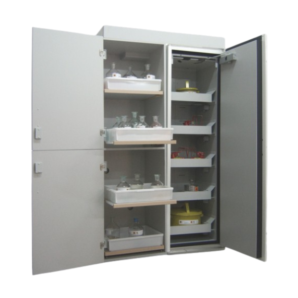 Wielofunkcyjne rozwiązanie przeznaczone do bezpiecznego, pasywnego składowania. Zapewnia bezpieczne magazynowanie materiałów łatwopalnych (Typ 90 - 90 min). Umożliwia jednoczesne składowanie kwasów, zasad, roztworów alkalicznych, materiałów toksycznych oraz innych niebezpiecznych chemikaliów. Przystosowana jest do przechowywania substancji w pojemnikach o różnej pojemności. Stosowana w pomieszczeniach roboczych, takich jak laboratoria i hale produkcyjne, w bezpośrednim pobliżu stanowiska pracy. Profesjonalne rozwiązanie spełniające najwyższe normy polskie i europejskie, eliminujące potrzebę budowania oddzielnych pomieszczeń magazynowych.