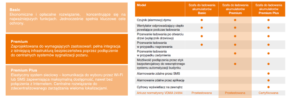 Szafa zabezpieczająca, przeciwwybuchowa z gniazdami do ładowania przeznaczona jest do przechowywania i ładowania akumulatorów litowo-jonowych. Zgodnie z wytycznymi VDMA szafa musi wytrzymać działanie płomieni i ciśnienia przez cały czas trwania pożaru, aż do całkowitego wypalenia się baterii. Test uznaje się za zaliczony, jeśli szafa skutecznie powstrzymuje ogień i nie dopuszcza do wydostania się płomieni na zewnątrz.