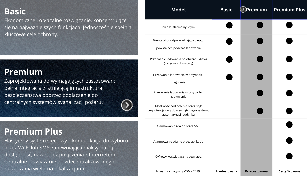 - Odłączenie zasilania przy nadmiernym wzroście temperatury, wykryciu dymu