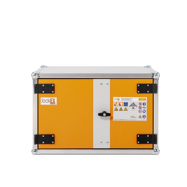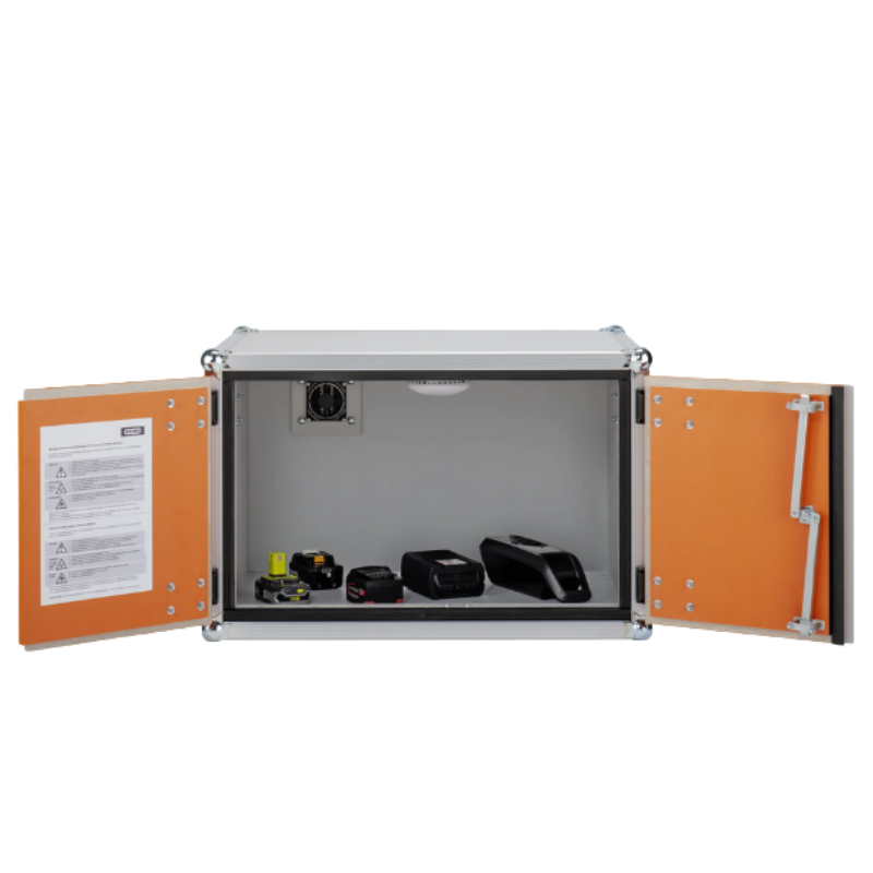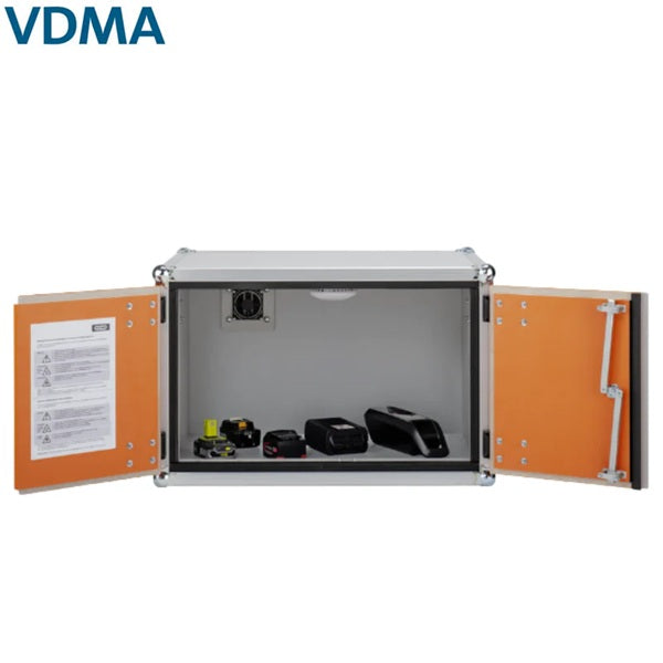 Szafa zabezpieczająca, przeciwwybuchowa przeznaczona do bezpiecznego przechowywania akumulatorów litowo-jonowych, zapewniająca maksymalną ochronę magazynowanych baterii. Zgodnie z wytycznymi VDMA szafa musi wytrzymać działanie płomieni i ciśnienia przez cały czas trwania pożaru, aż do całkowitego wypalenia się baterii. Test uznaje się za zaliczony, jeśli szafa skutecznie powstrzymuje ogień i nie dopuszcza do wydostania się płomieni na zewnątrz.