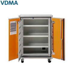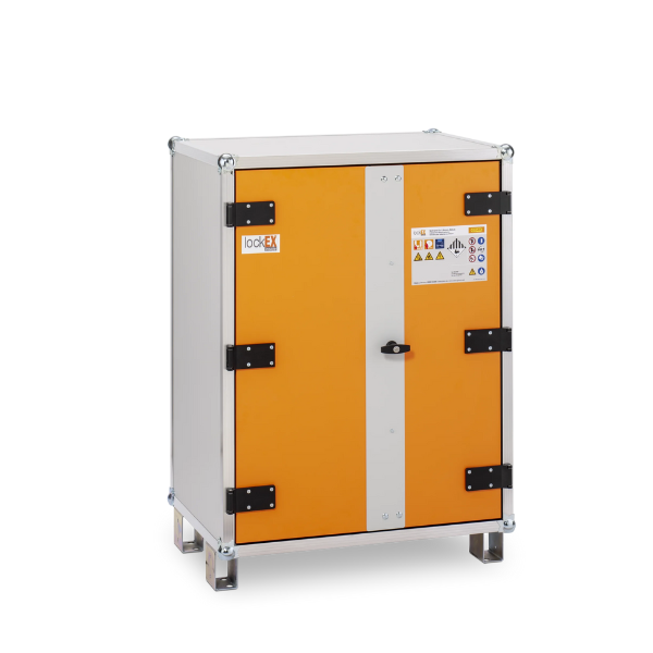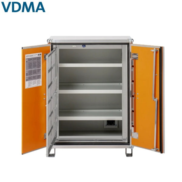Szafa zabezpieczająca, przeciwwybuchowa przeznaczona do bezpiecznego przechowywania akumulatorów litowo-jonowych, zapewniająca maksymalną ochronę magazynowanych baterii. Zgodnie z wytycznymi VDMA szafa musi wytrzymać działanie płomieni i ciśnienia przez cały czas trwania pożaru, aż do całkowitego wypalenia się baterii. Test uznaje się za zaliczony, jeśli szafa skutecznie powstrzymuje ogień i nie dopuszcza do wydostania się płomieni na zewnątrz.