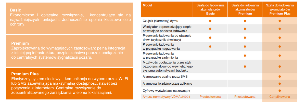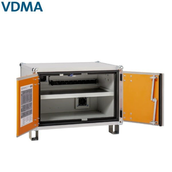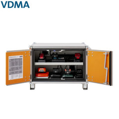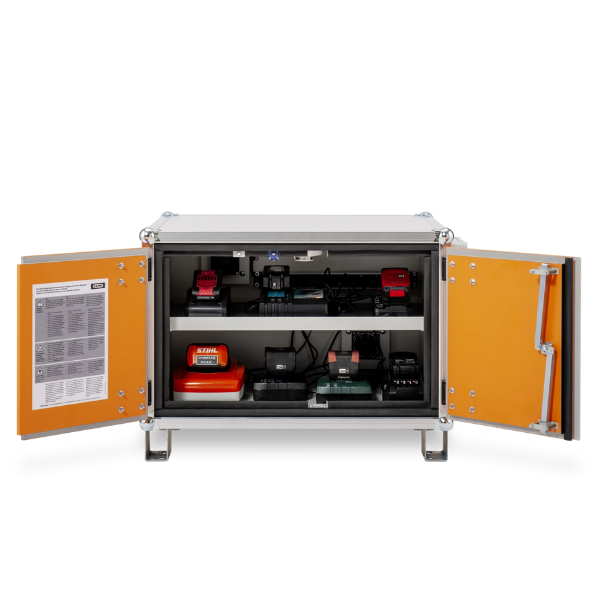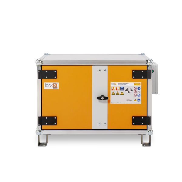 Szafa zabezpieczająca, przeciwwybuchowa z gniazdami do ładowania przeznaczona jest do przechowywania i ładowania akumulatorów litowo-jonowych. Zgodnie z wytycznymi VDMA szafa musi wytrzymać działanie płomieni i ciśnienia przez cały czas trwania pożaru, aż do całkowitego wypalenia się baterii. Test uznaje się za zaliczony, jeśli szafa skutecznie powstrzymuje ogień i nie dopuszcza do wydostania się płomieni na zewnątrz.
