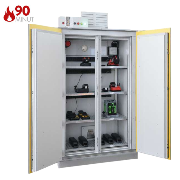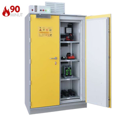 Szafa ognioodporna 90 min przeznaczona jest do aktywnego i pasywnego ładowania i przechowywania baterii i akumulatorów litowo-jonowych o różnych pojemnościach. Stosowana powszechnie w laboratoriach, biurach, magazynach i na stanowiskach produkcyjnych. Gwarantuje najwyższy poziom zabezpieczenia przed skutkami awarii akumulatorów oraz pożarem. Spełnia wymogi najnowszych norm europejskich oraz optymalną organizację wnętrza, umożliwiającą zarówno ładowanie, jak i przechowywanie baterii.